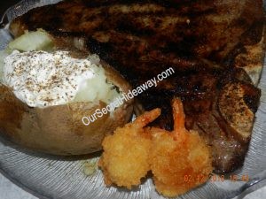 T-bone steak, baked potato (with or without butter and sour cream, shrimp, salad, rolls. Mmmm