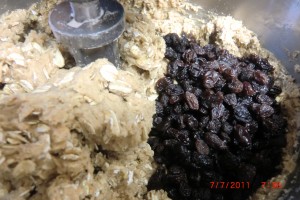 Now lets add some raisins at this point. You shouldn’t use a mixer after mixing the flour into the wet ingredients but as I have said before…. I am a rebel. ( laugh )