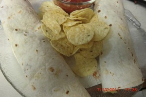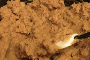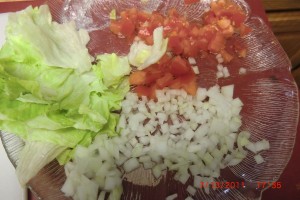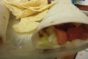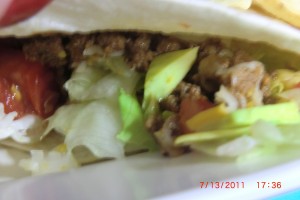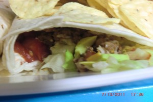 They are just tortillas stuffed with ground beef cooked with onions and taco seasoning, re-fried beans, lettuce, tomatoes, raw onions, shredded cheese, sour cream or salsa ( or both ). Oh heck…. put anything you like on it.