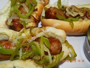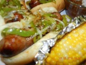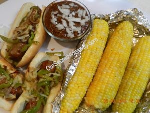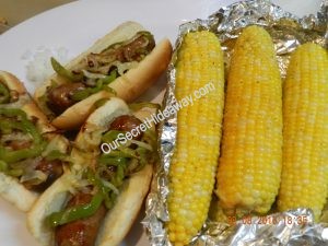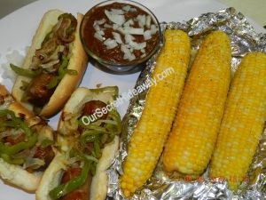 Brats, Corn, Baked beans, Potato salad, Cold three bean salad, and Chips