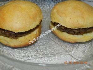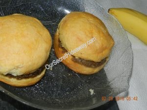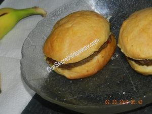 Homemade sausage and biscuit sandwiches, banana and beverage.