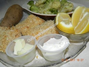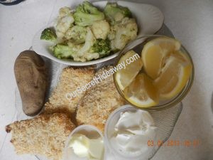 Crispy Cod, with roasted broccoli, baked potato with sour cream, and tossed salad.