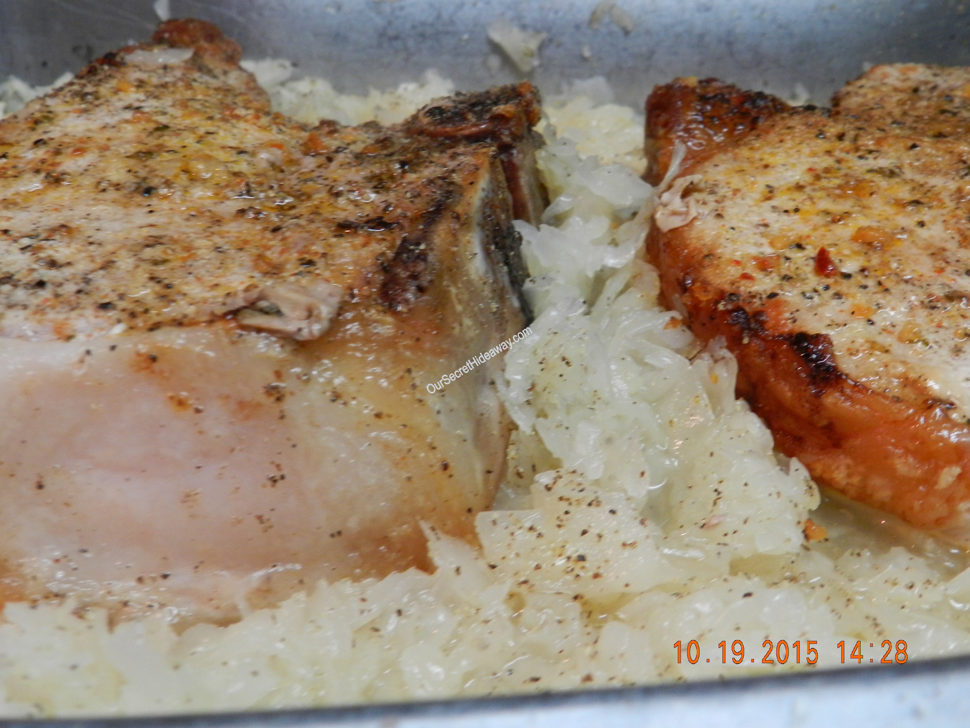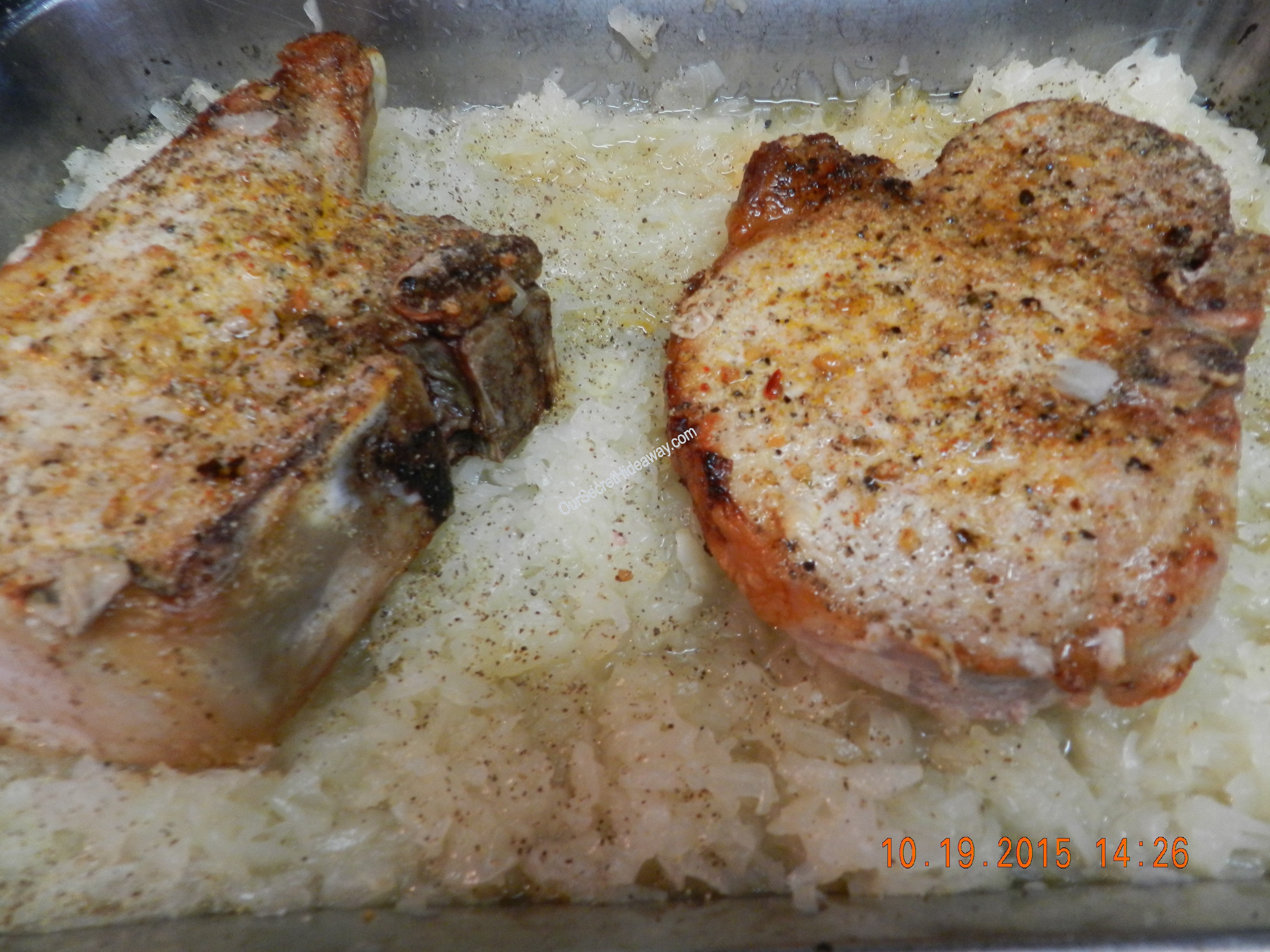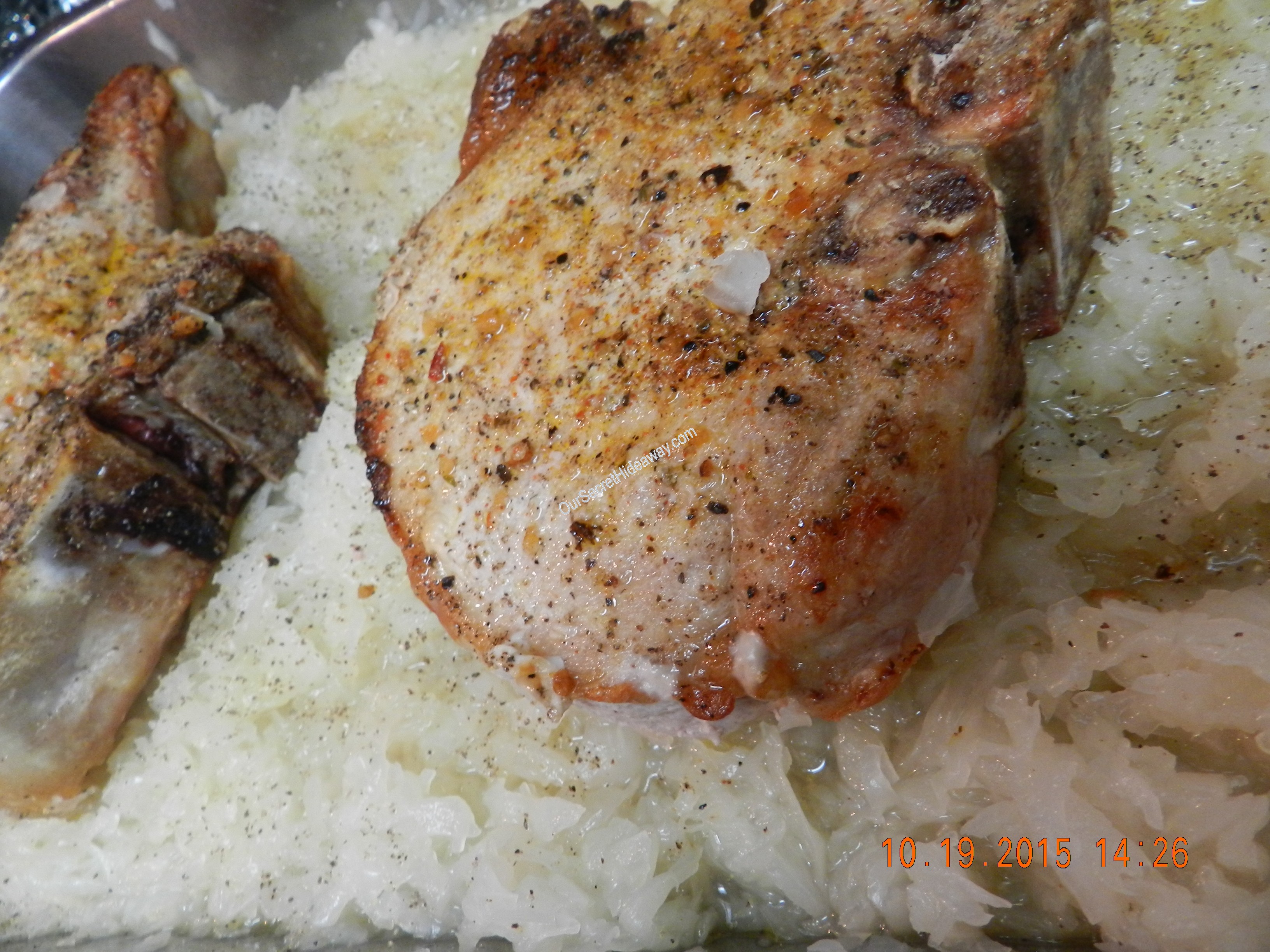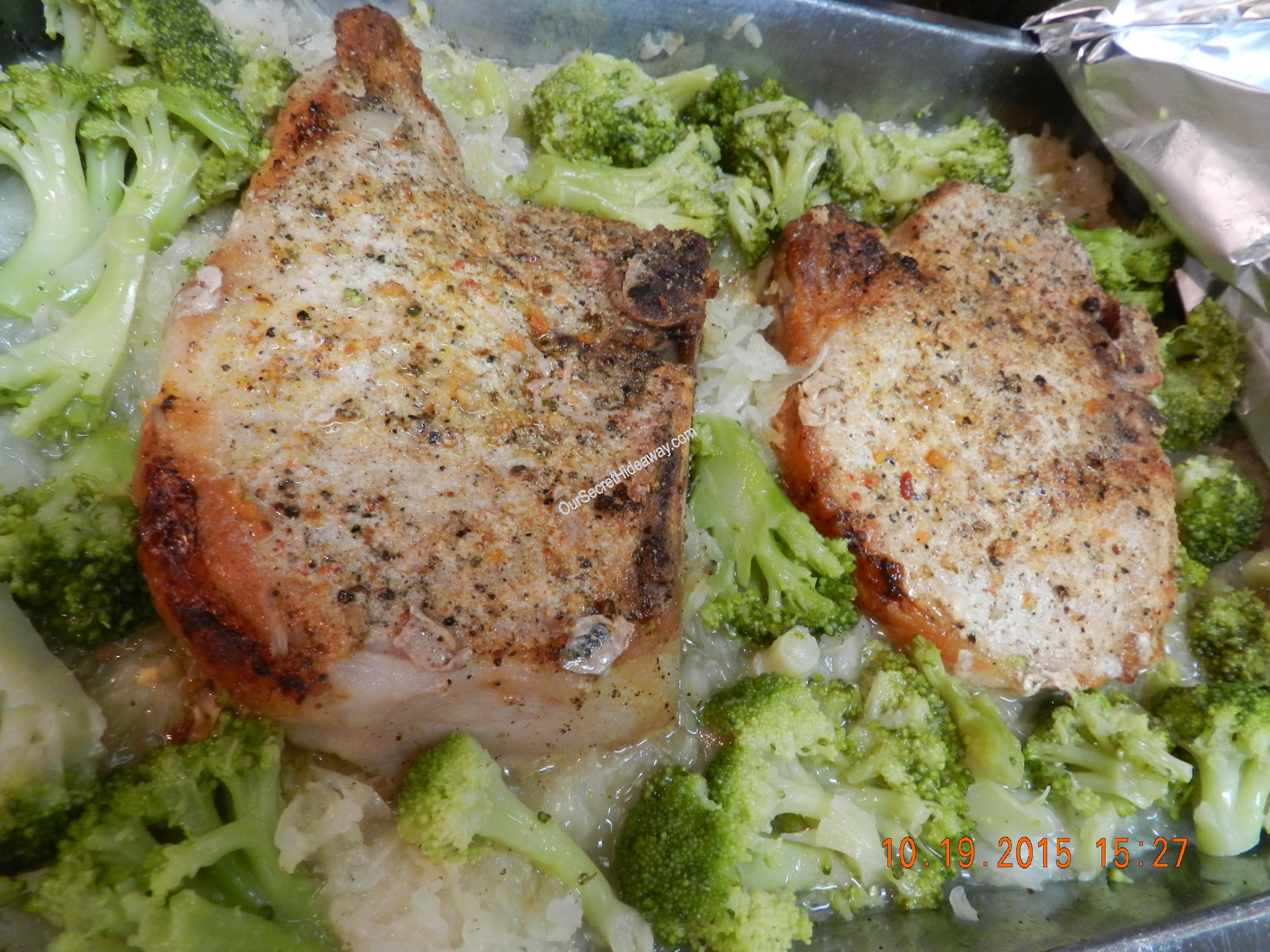 One pan and simple. Baked Pork Chops with Sauerkraut and broccoli.