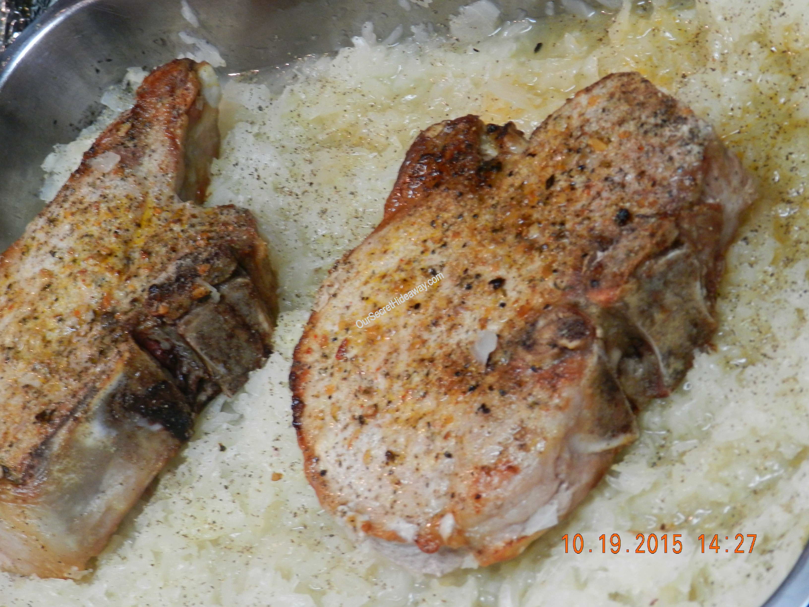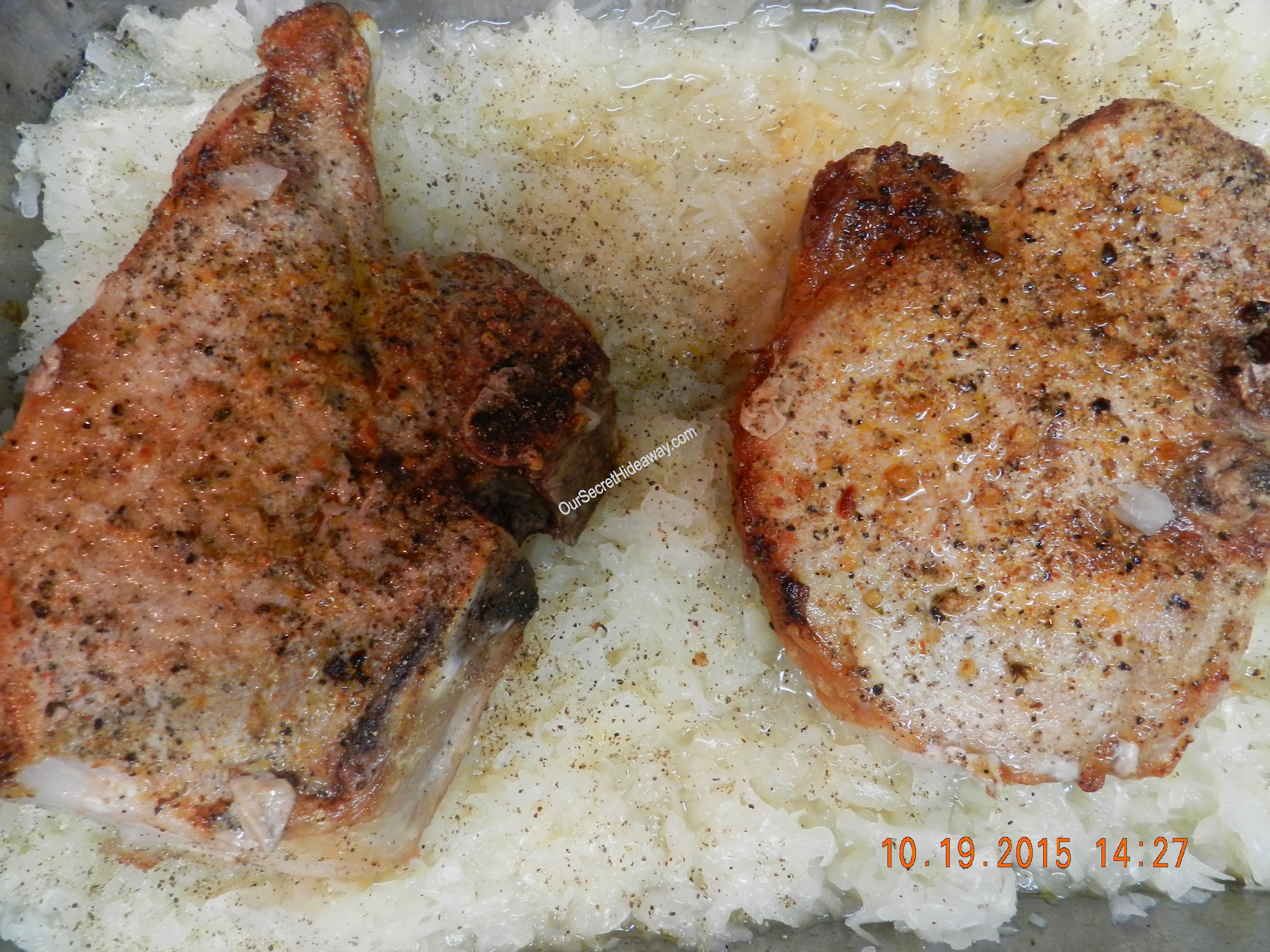 Pork chops browned up……now time to put on top of the sauerkraut . Add broccoli, cover, and bake.