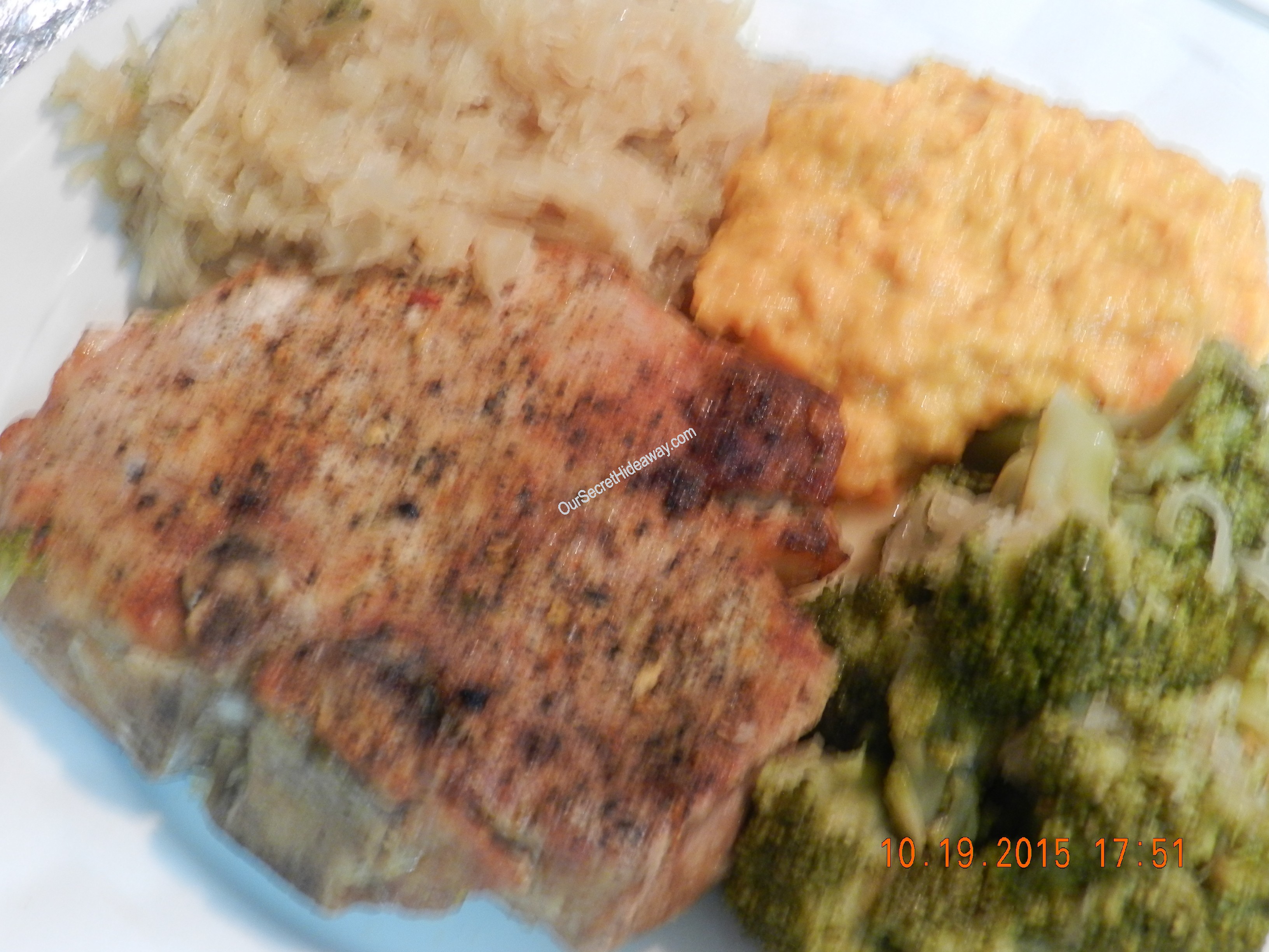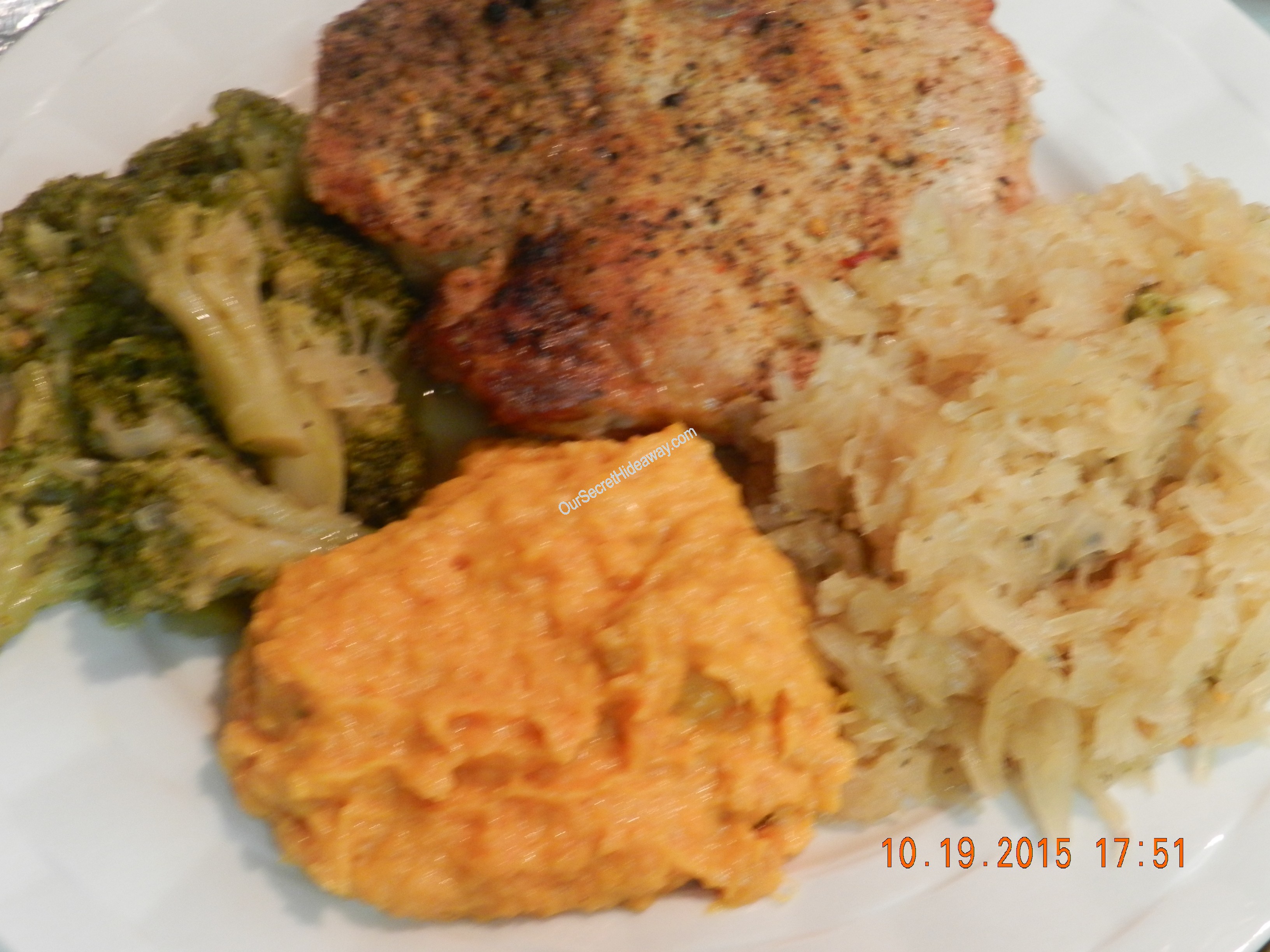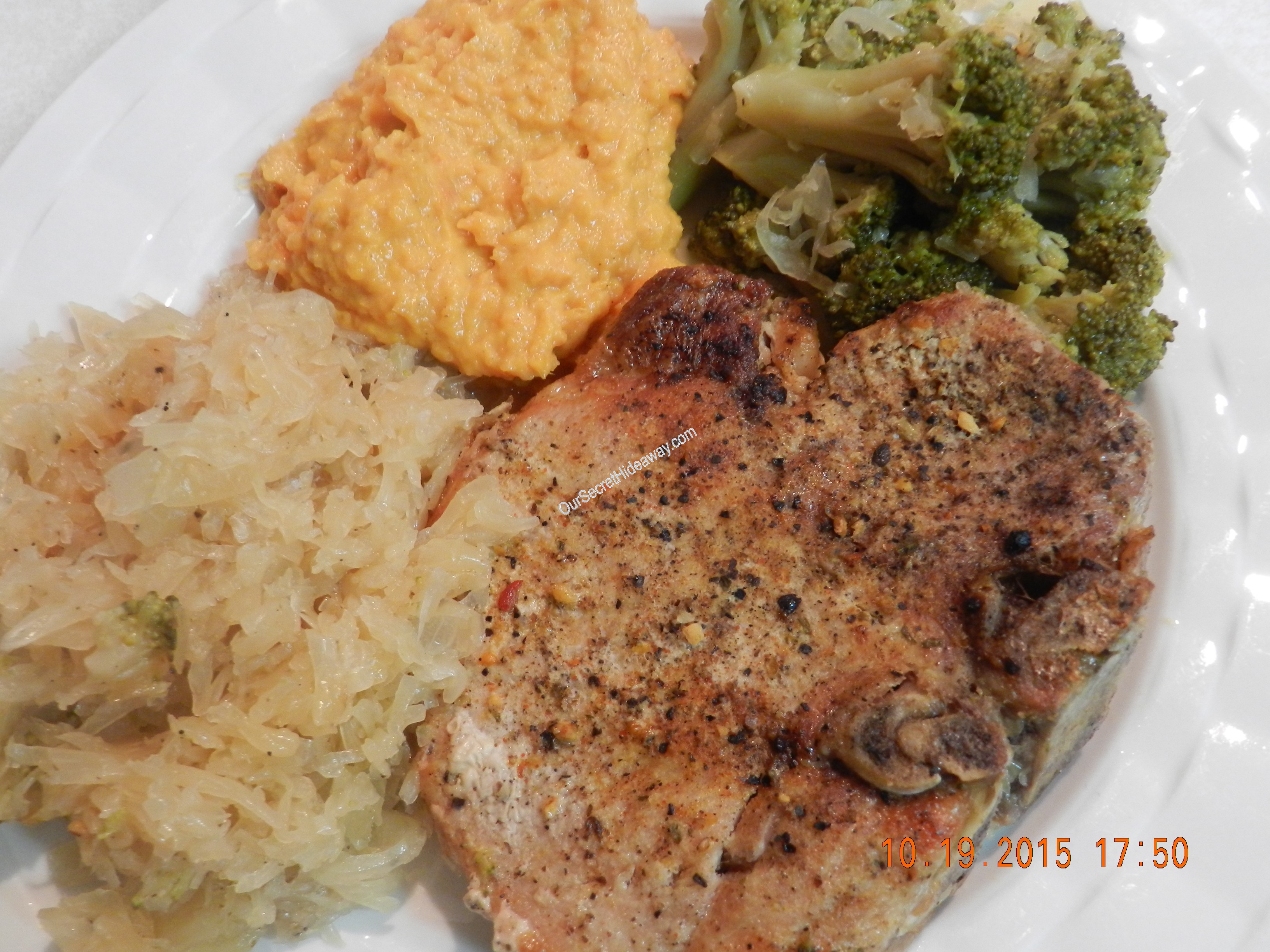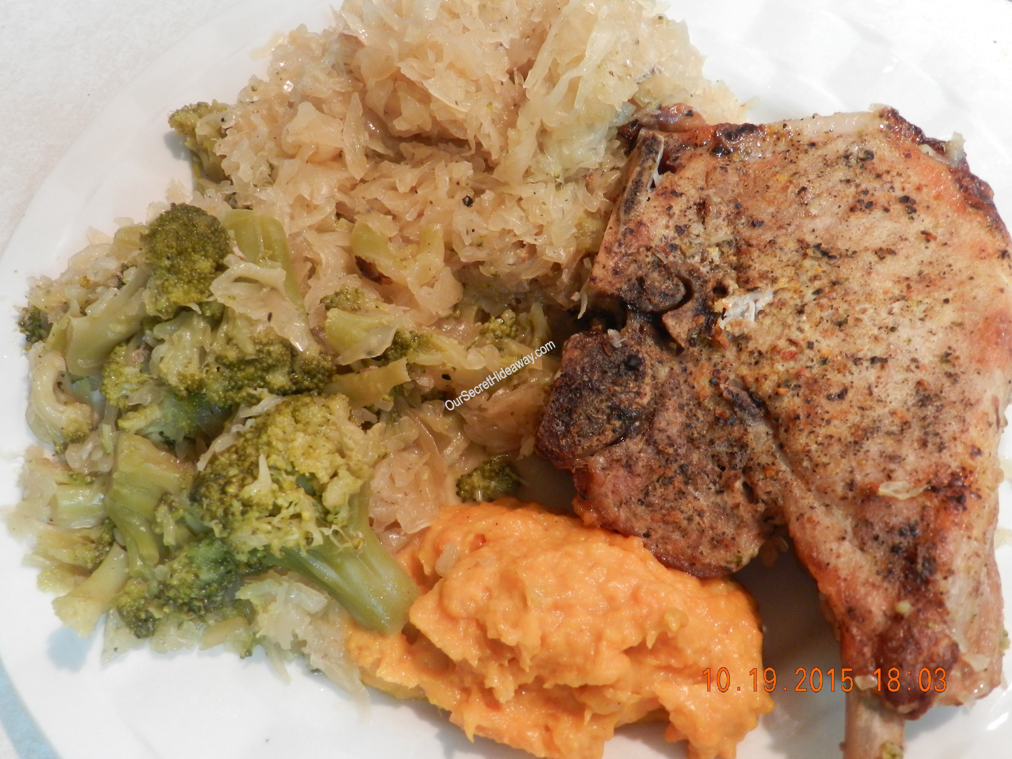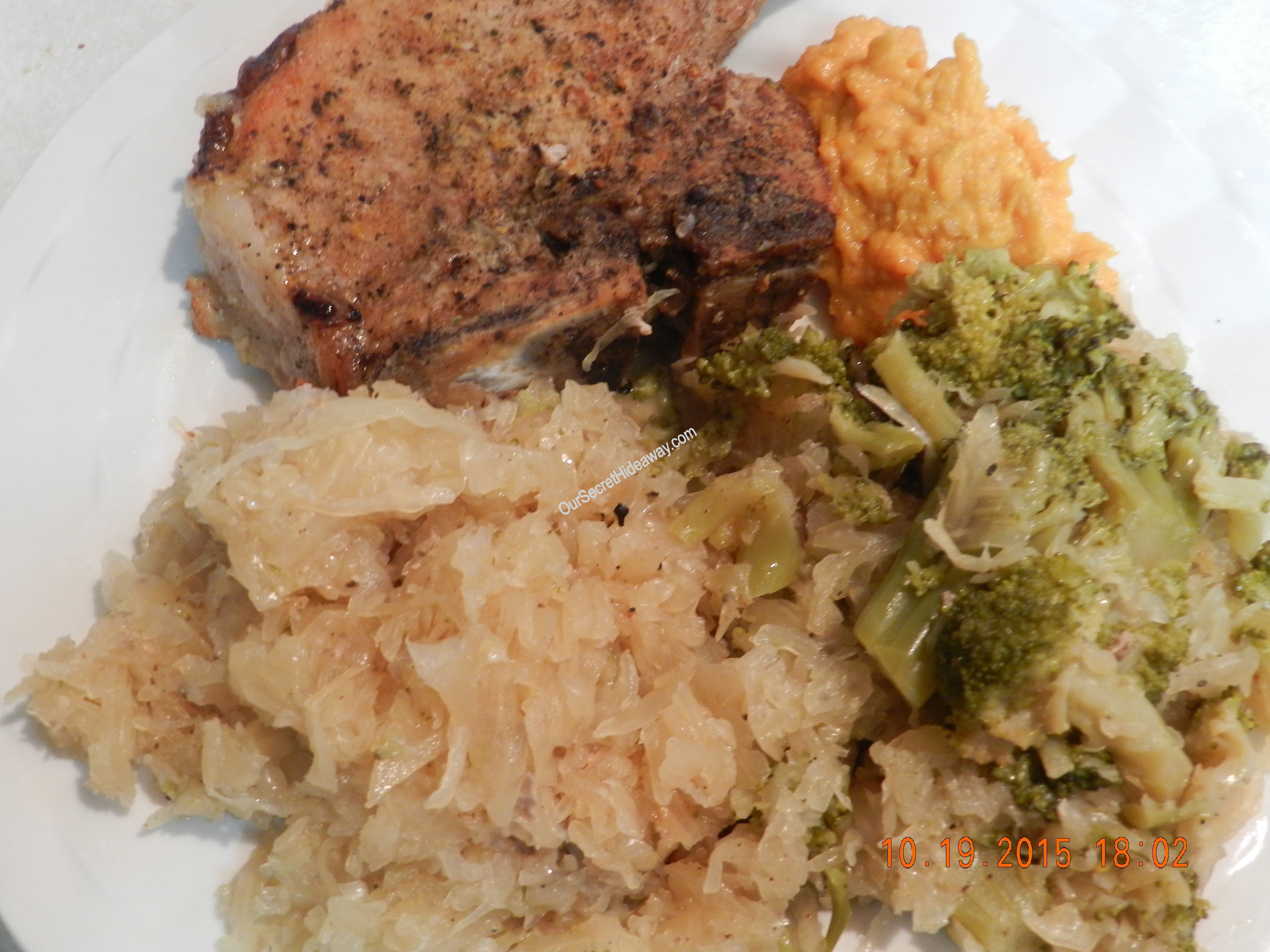 Baked Pork Chop with Sauerkraut and broccoli. Baked sweet potato mashed with butter and heavy cream. ( and a loss next morning.)