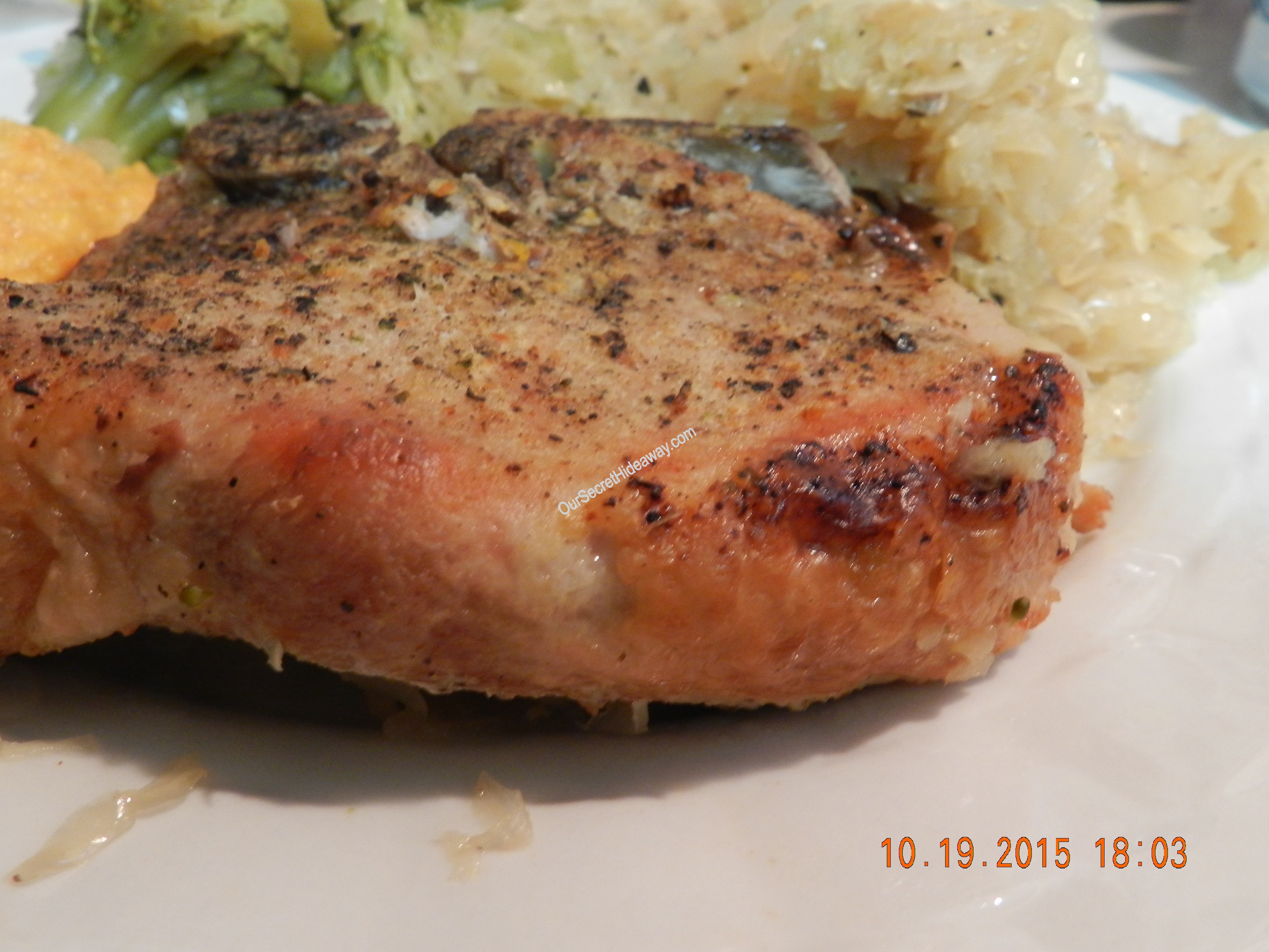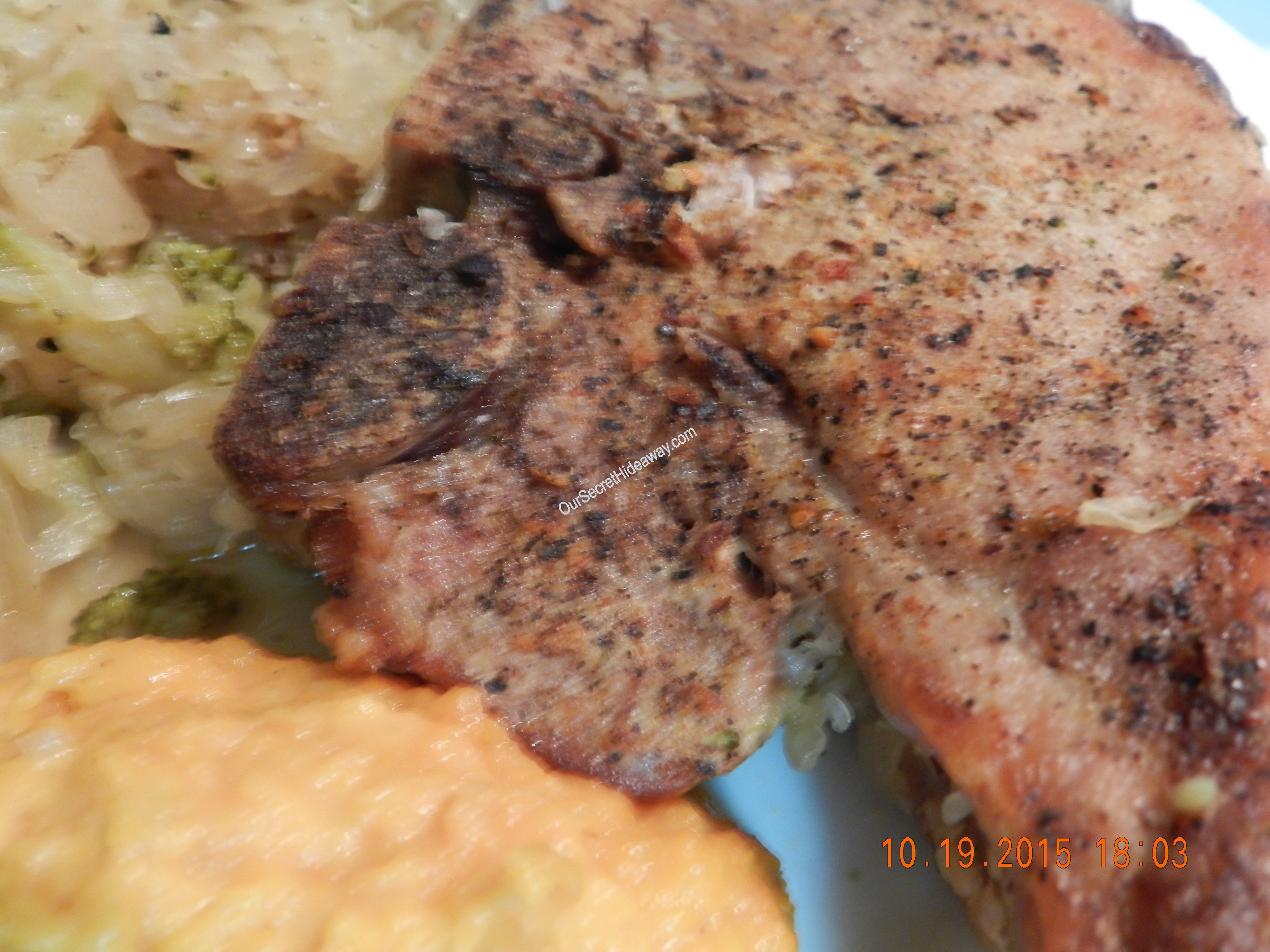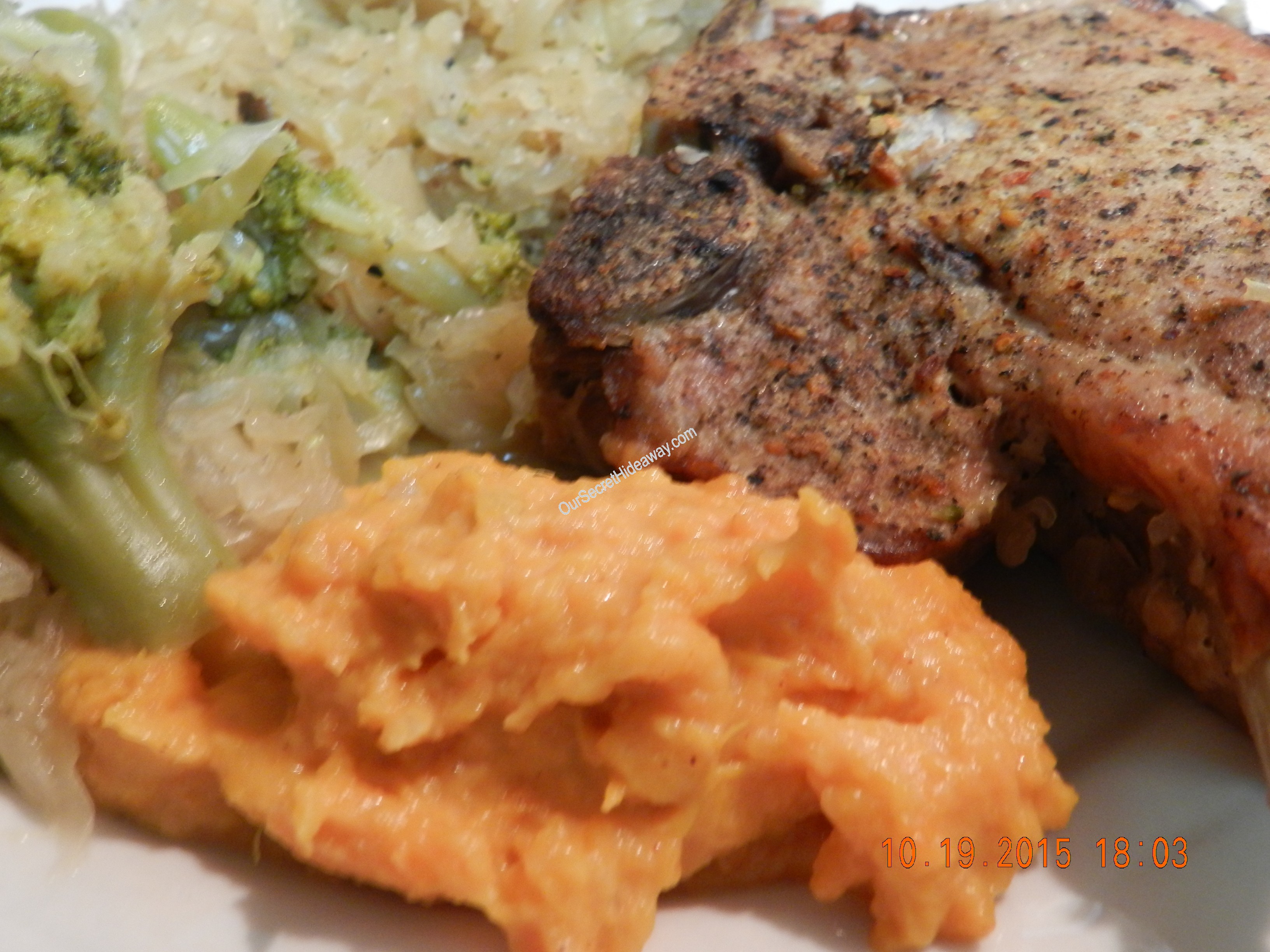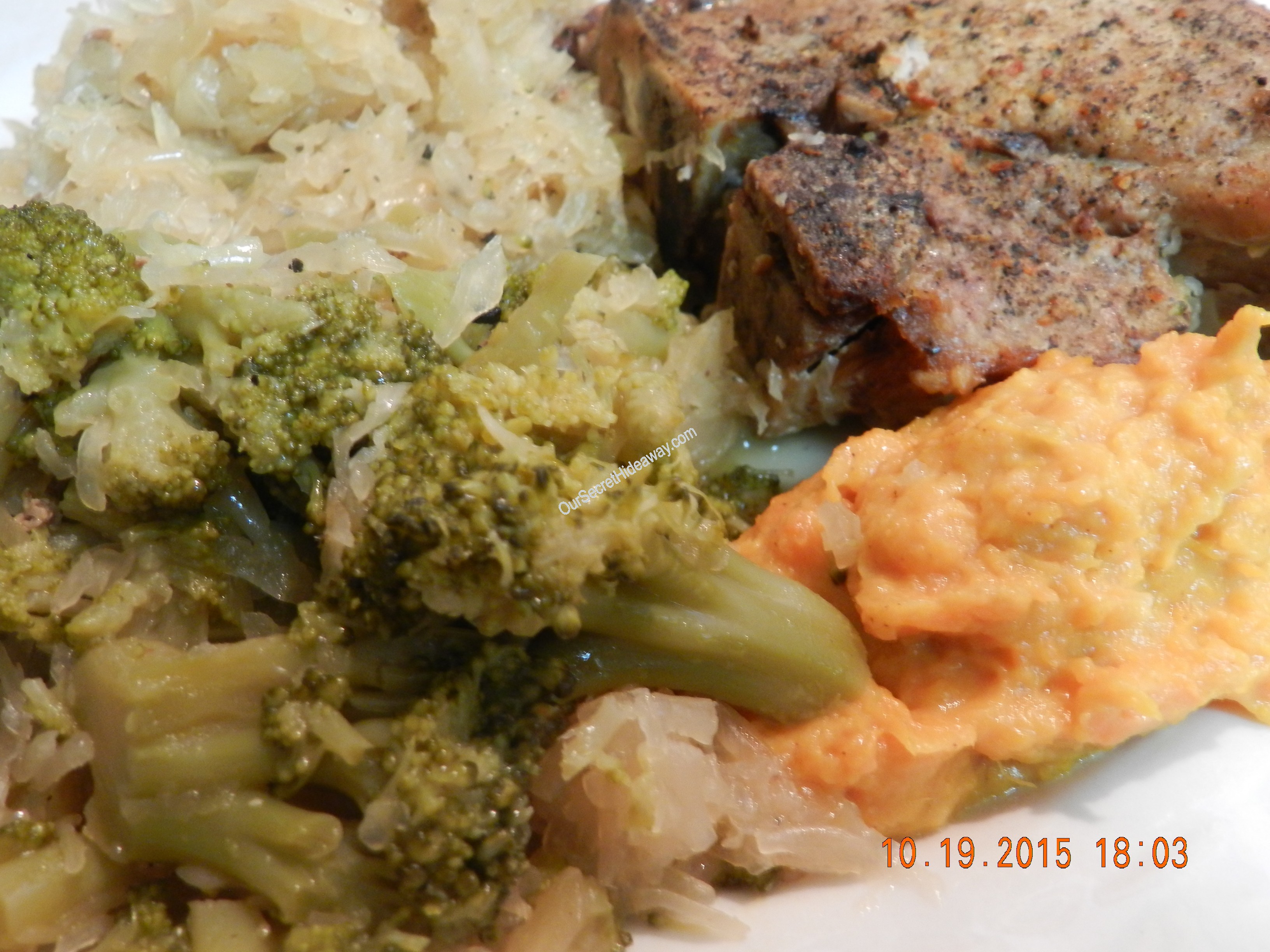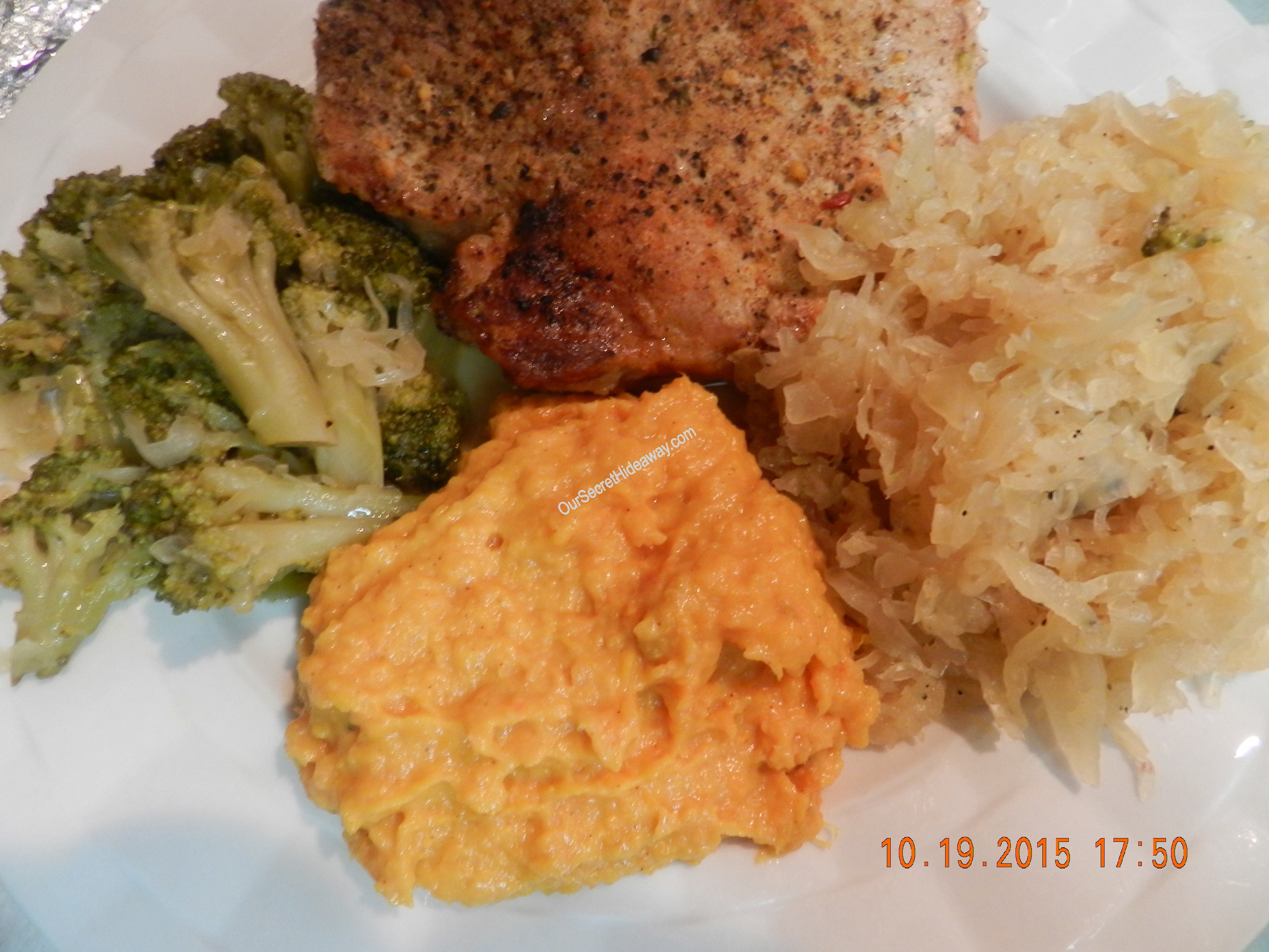 Baked Pork Chop with Sauerkraut and broccoli. Baked sweet potato mashed with butter and heavy cream. ( and a loss next morning.)