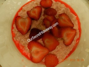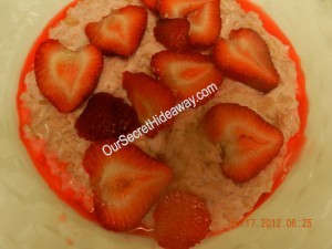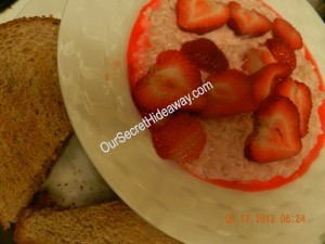 Oatmeal, fresh strawberries, Di Vinci sugar free strawberry syrup and whole wheat toast. Now this is a breakfast that would stay with a person for hours. Yum ! ( no, not mine )