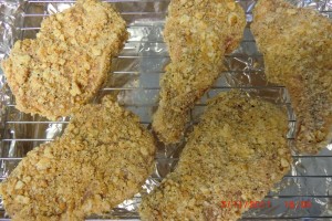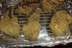 wish the eggs…… dip the pork chops……. place on a backing pan lined with foil and sprayed with cooking srpay……
