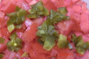 Take 2 med or one real large tomato and dice it. Not tiny, just dice it. Now dice a jalapeno pepper after removing the seeds and veins. Or if you only have jarred or canned… good enough. Maybe a tablespoon of either of those. Now add it to the maters.