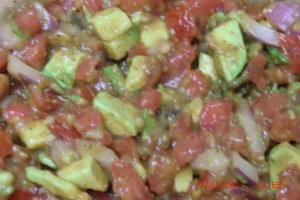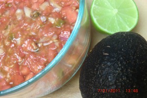 Now take a ripe avacado and dice it. Yes, same size as the maters and onions *smile*. Now throw it into the bowl with the other stuff and mix. Cut a lime in half and squeeze it in the bowl. Place a piece of plastic wrap on the bowl and put it in the fridge until dinner. This is what is going on the sandwiches and also on the side to scoop up some tortilla chips. *crunch crunch*. Please tell me that you are going to double this recipe… it would be good on anything or just to scoop.