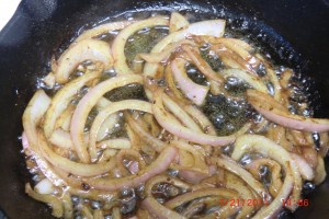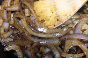 Now add thinly sliced onions to the hot pan and about one tablespoon of butter. Don’t burn the butter please. stir fast just long enough that they are no longer “raw”. I hope you are scrapping all the bits from the bottom of the pan. That is the yummy stuff.
