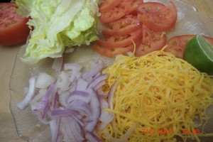 At this point I sliced tomatoes, grated cheddar cheese, sliced raw red onion, and shredded lettuce for the sandwiches. These were supposed to be served with salsa. Well , that is what was suggested, but you know me…. I’m a rebel, and made my own sauce. Recipe to follow.
