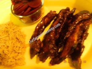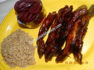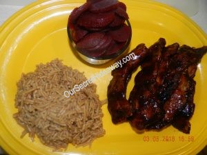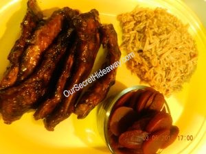 Riblettes, flavored rice, and sliced beets. Not gourmet but dinner anyway.