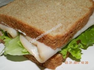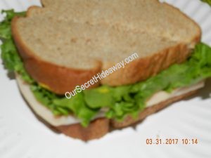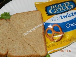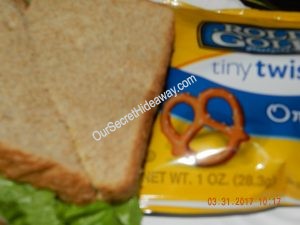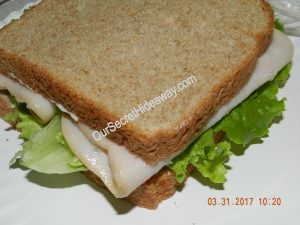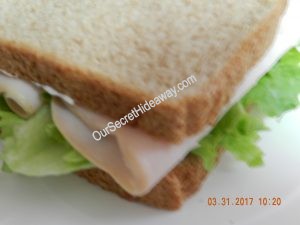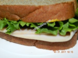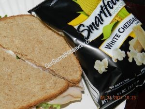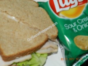 Turkey sandwiches …… One with mustard and pretzels…………..One with Hellman’s Real mayo, and white cheddar popcorn…. and the last one is with Miracle whip and sour cream and onion chips.