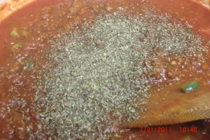 I added about 2 tsp of Italian seasoning, 2 tsp of garlic powder ( yes, more garlic). You can omit this if your garlic is fresh and smells very strong. We like extra garlic. Then about 2 tsp of black pepper, 1 large pinch of red pepper flakes. Now stir……..