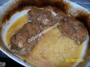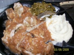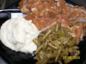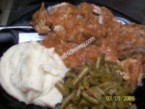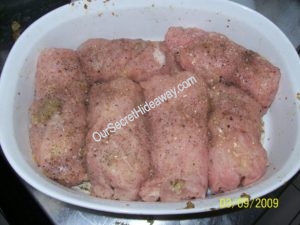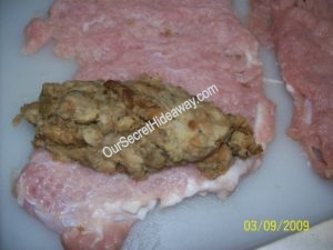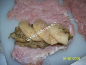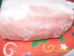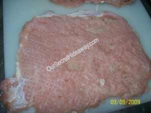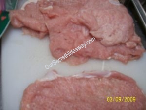 whole pork loin cut into roast. Now I took the roast and sliced into boneless chops. Then I took a meat tenderizer and beat them silly. It always helps to think of something or someone that made you mad.