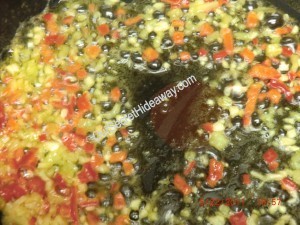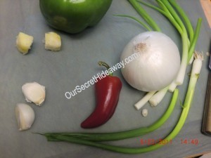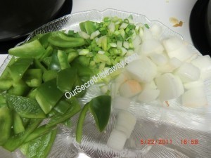 .Ok time to chop the green peppers, while and yellow onion, green onions, carrots and celery.