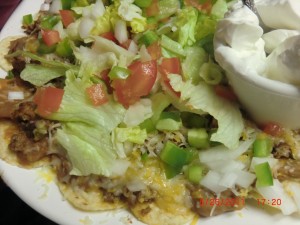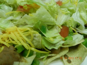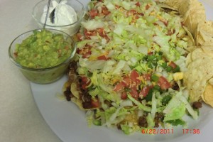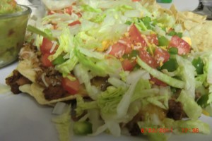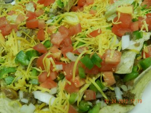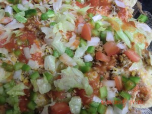 Tortilla chips…..Re-fried beans…. chopped onions and ground beef flavored with taco seasoning ….. shredded cheese (melted on the top of that then….chopped green pepper…. chopped raw onions…. chopped tomatoes… shredded cheese (cold) …. chopped lettuce….sliced avocado and toppings of choice