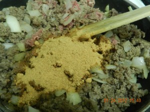 brown the ground beef and onions. … then add taco seasoning and red pepper flakes ( or any seasoning you like.)