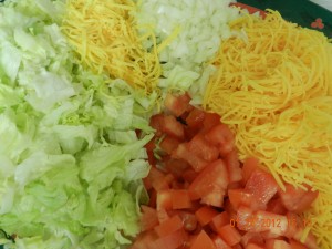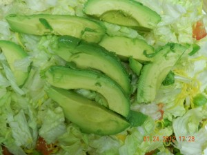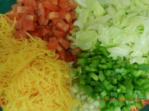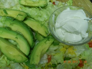 Now chop the tomato, green pepper, onion and lettuce. Shred the cheese and slice the avacado.