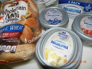 whole grain ( 100% whole wheat) bagel with Philadelphia flavored cream cheeses or plain if you choose. (Took photos later in morning of the packages below )