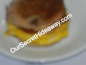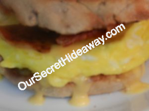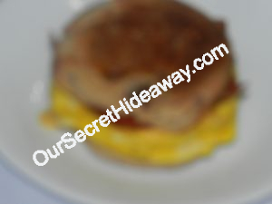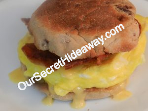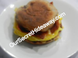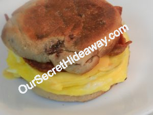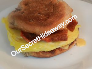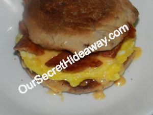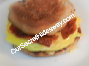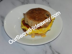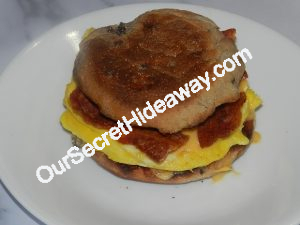 What’s for breakfast…. English muffin, egg, bacon and cheese sandwich.