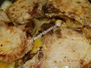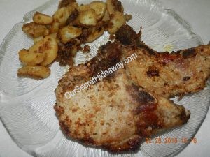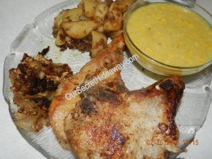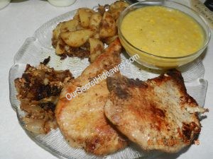 What’s for dinner tonight? Pork Chops, potatoes, apples and onions, and homemade creamed corn. Served with a tossed salad.
