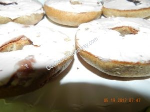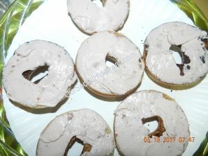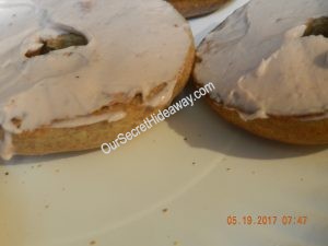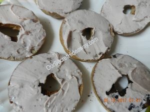 Here is a plate of whole wheat bagels with strawberry cream cheese on one plate and blueberry on the other.